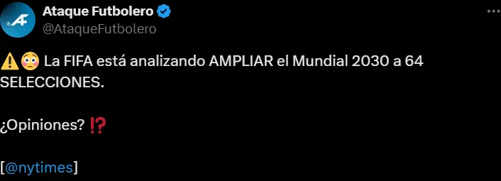 Según informaron en el prestigioso diario The New York Times, la FIFA piensa en extender la cantidad de equipos para el Mundial 2030. Si bien recién el año que viene comenzarán a jugar 48 por primera vez, piensan en que la competición que se disputará en Europa, África y Sudamérica tenga la posibilidad de que haya 64 seleccionados.