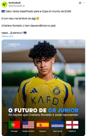 Hay que dejar en claro que cuando algún jugador tiene ascendencia de otro país puede ser naturalizado para disputar partidos con la selección, pero requiere de ciertos requisitos. En este caso, se ha revelado que Cristiano Jr. por parte de su bisabuela podría pertenecer a Cabo Verde y de esa manera jugar el mismo Mundial que su padre.