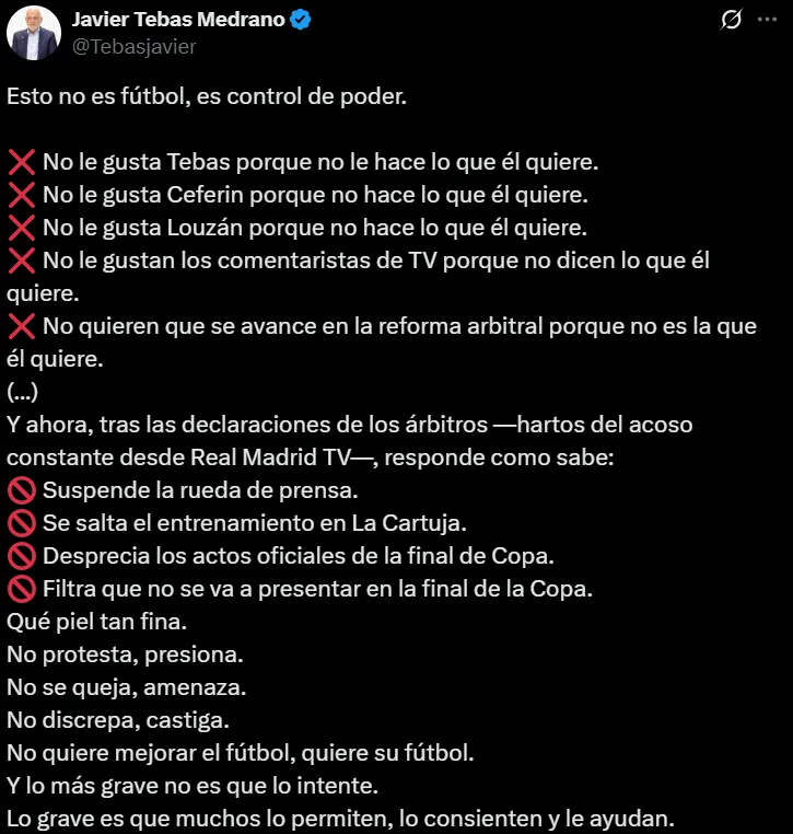 “No le gusta Tebas porque no hace lo que él quiere, No le gusta Ceferin (NdeR: presidente de la UEFA) porque no hace lo que él quiere, no le gusta Louzán (presidente de la Real Federación Española de Futbol) porque no hace lo que él quiere (…) no quiere mejorar el futbol, quiere su futbol. Y lo más grave no es que lo intente. Lo grave es que muchos lo permiten, lo conscientes y le ayudan”, escribió Javier Tebas.
