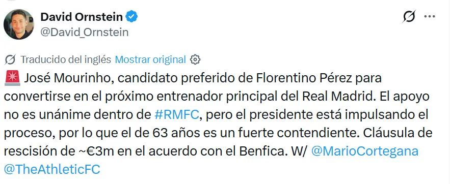 La misma fuente aseguró que la cláusula de salida del técnico ronda los 3 millones de euros, una cifra considerada accesible para un club del poder económico del Real Madrid. Mourinho ya tuvo un exitoso primer ciclo en la institución entre 2010 y 2013.