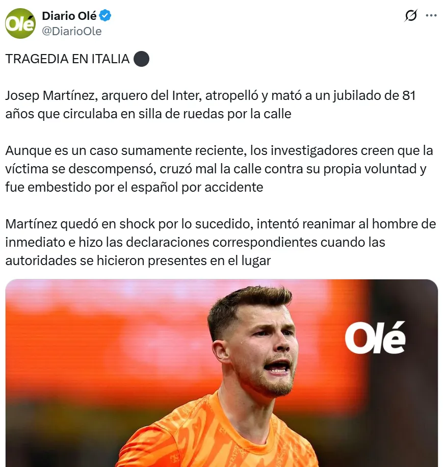 Inter de Milán es noticia en el mundo del futbol pero no por temas futbolísticos. Su arquero suplente, Josep Martínez, atropelló a una persona mayor cerca del predio donde entrena el conjunto italiano y lamentablemente terminó con la vida de la persona de 81 años.