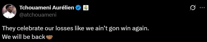 Uno de los mensajes más contundentes llegó de la mano del francés Aurélien Tchouameni. En su cuenta personal de X (ex Twitter), el francés, autor de uno de los goles de la Casa Blanca en la derrota copera, le envió un tiro por elevación a Barcelona y dio a entender que su equipo no bajará los brazos a pesar del mencionado traspié. “Celebran nuestras derrotas como si no fuéramos a ganar nuevamente. Volveremos”, escribió.