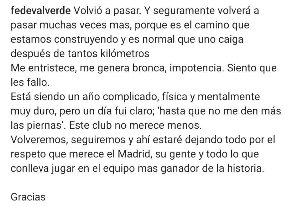 Finalmente, el mediocampista uruguayo fue uno de los que más se explayó en las redes sociales, espacio en el que aprovechó para disculparse con la afición. “Volvió a pasar. Y seguramente volverá a pasar muchas veces más, porque es el camino que estamos construyendo y es normal que uno caiga después de tantos kilómetros. Me entristece, me genera bronca, impotencia. Siento que les fallo. Está siendo un año complicado, física y mentalmente muy duro, pero un día fui claro: ‘Hasta que no me den más las piernas’. Este club no merece menos”, indicó.