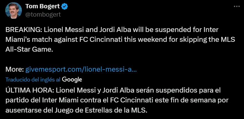 Tal como confirmó el periodista Tom Bogert esta mañana, la MLS tomó la decisión de sancionar por un partido tanto a Lionel Messi como Jordi Alba por haberse negado a disputar el All-Star Game. Esta era una información que se había adelantado cuando se supo que Leo no sería parte del encuentro y la Major League Soccer así lo ratificó sin importar la magnitud de las figuras afectadas.
