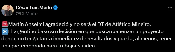 Pero Anselmi finalmente no será el que se hará cargo del proyecto. Según informó el periodista César Luis Merlo, el ex Cruz Azul agradeció la propuesta ya que no quiere llevar a cabo un proyecto que ya este empezado dado que su idea es por lo menos tener una pretemporada.