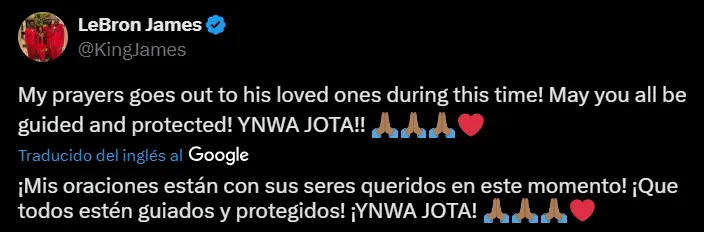 Uno de los mensajes más destacados vino de LeBron James, leyenda de la NBA y accionista del Liverpool. A través de su cuenta en X, el basquetbolista expresó sus condolencias y apoyo a los seres queridos de Jota: “¡Mis oraciones están con sus seres queridos en este momento! ¡Que todos estén guiados y protegidos! ¡YNWA JOTA!”.