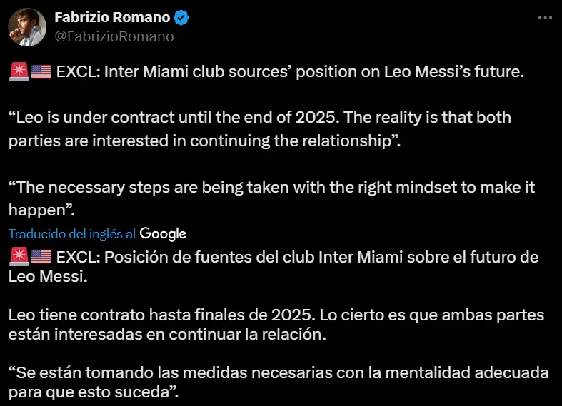 Fabrizio Romano, periodista especializado en mercado de fichajes, informó en exclusiva este lunes que tanto Inter Miami como Lionel Messi ven con buenos ojos la posibilidad de extender el vínculo que vence en diciembre de este año. Sin embargo, por el momento solo es un deseo y está lejos de confirmarse la continuidad del máximo ganador del Balón de Oro en las Garzas.