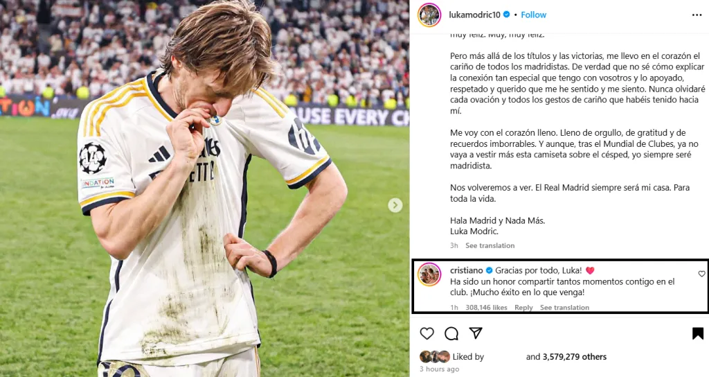 El propio Modric anunció su salida en redes sociales y algunos de sus excompañeros más destacados del Real se hicieron presentes en la caja de comentarios. Uno de los primeros fue Cristiano Ronaldo, quien escribió: “Gracias por todo, Luka! Ha sido un honor compartir tantos momentos contigo en el club. ¡Mucho éxito en lo que venga!”.