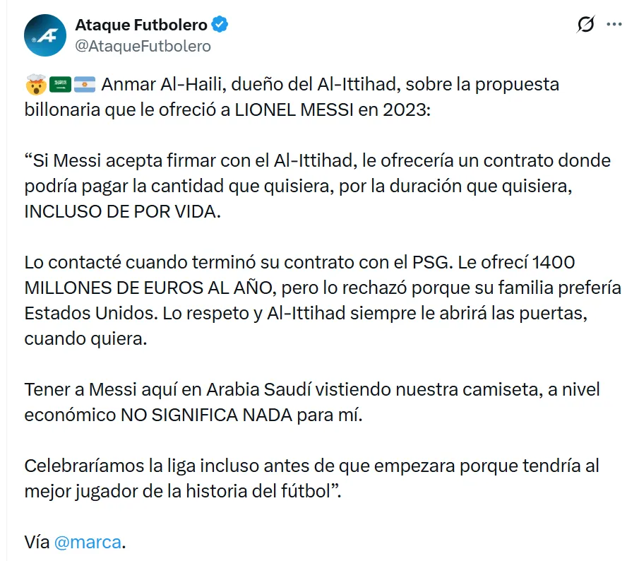 “Si Messi acepta firmar con el Al-Ittihad, le ofrecería un contrato donde podría pagar la cantidad que quisiera, por la duración que quisiera, incluso de por vida”, expresó Anmar Al-Haili, dueño del Al-Ittihad en primer lugar sobre el deseo de contar con Messi.