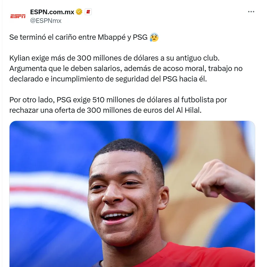 - El PSG exige a Mbappé 510 millones de dólares por rechazar una oferta del Al Hilal.