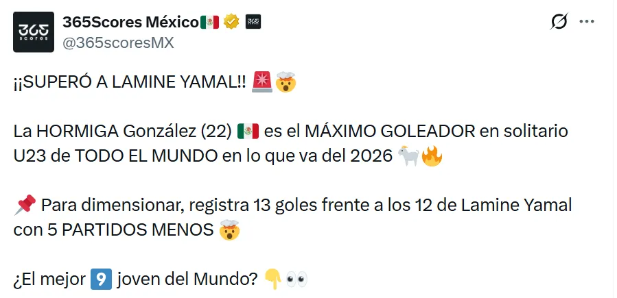 Pero lo más llamativo no es solo su impacto en la Liga MX. A nivel global, la “Hormiga” está firmando números que lo ponen en la conversación internacional. Con 13 goles en lo que va del 2026, se convirtió en el máximo goleador Sub-23 en solitario en todo el mundo.