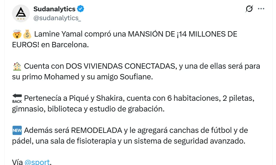 El futbolista español realizó una compra impactante: una propiedad valuada en 14 millones de euros, ubicada en una de las zonas más exclusivas de Barcelona. La vivienda cuenta con dos casas conectadas, una destinada a su primo Mohamed y a su amigo Soufiane. Además, la mansión pertenecía anteriormente a Gerard Piqué y Shakira, y posee seis habitaciones, dos piscinas, gimnasio, biblioteca y estudio de grabación.