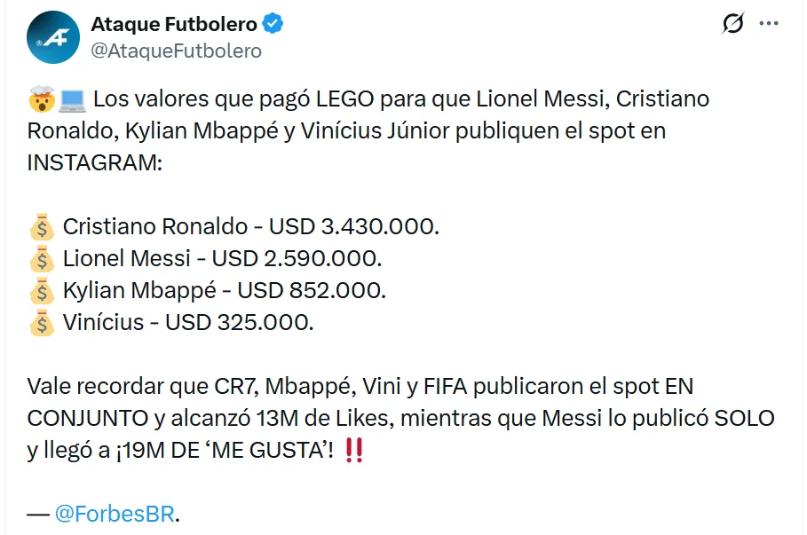 Mientras Cristiano Ronaldo cobró una cifra impactante por la campaña de LEGO, también salió a la luz cuánto recibió Lionel Messi por formar parte del mismo proyecto. El anuncio rompió las redes sociales desde el primer minuto y no solo por ellos, ya que también aparecieron figuras como Kylian Mbappé y Vinícius Júnior.