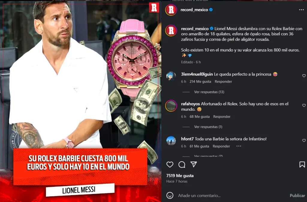 Recientemente, Messi sorprendió a todos con un llamativo reloj de edición limitada de Barbie, que captó la atención de sus fanáticos. La pieza destaca por su cuerpo de oro amarillo de 18 quilates, su esfera rosa de ópalo, un bisel engastado con 36 zafiros fucsia y una correa de piel de aligátor en tono rosado.