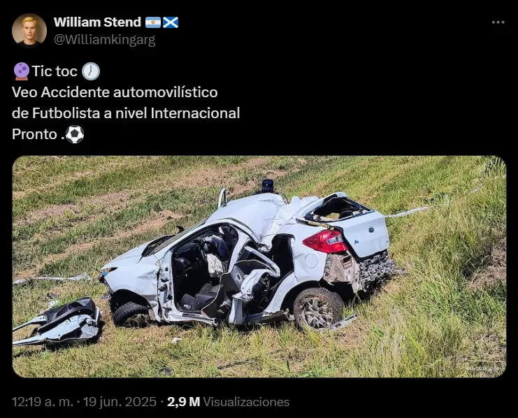 Se trata de William Stend, argentino que dejó este mensaje: “Veo accidente automovilístico de futbolista a nivel internacional. Pronto”, escribió, y el mismo superó las 2,9 millones de visualizaciones ya que muchos no podrían creer lo que estaban leyendo. Lo había dicho el 19 de junio y la tragedia ocurrió el 3 de julio.