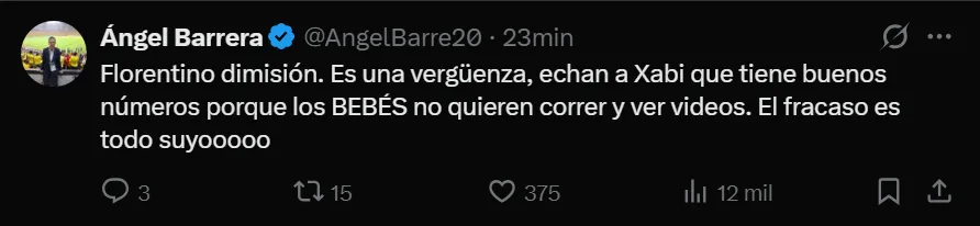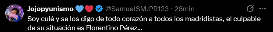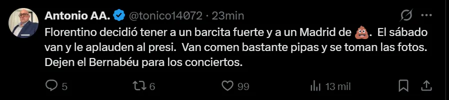 Las redes sociales se llenaron de comentarios contra Florentino Pérez, presidente del club. Luego de perder con el Barcelona, el dirigente decidió despedir a Xabi Alonso de su cargo de entrenador y darle la responsabilidad a Álvaro Arbeloa, quien no pudo ordenar la casa en pocos días de trabajo. En ese contexto, para los seguidores del club está claro que Floren debe asumir la responsabilidad de todo lo que está sucediendo puertas adentro y que se traduce hacia afuera.