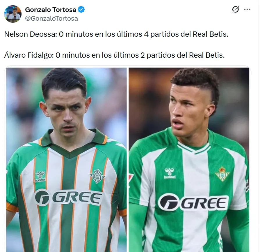 Sin embargo, el presente de ambos está lejos de lo esperado. El entrenador no ha contado con ellos en los últimos partidos: Deossa acumula cero minutos en los últimos cuatro encuentros del Betis, mientras que Fidalgo tampoco sumó en los últimos dos, algo que sorprendió mucho teniendo en cuenta que venía siendo titular.