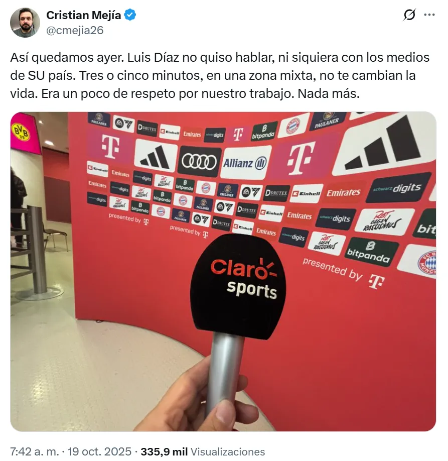 “Así quedamos ayer. Luis Díaz no quiso hablar, ni siquiera con los medios de su país. Tres o cinco minutos, en una zona mixta, no te cambian la vida. Era un poco de respeto por nuestro trabajo. Nada más”, reveló el periodista colombiano Cristian Mejía.