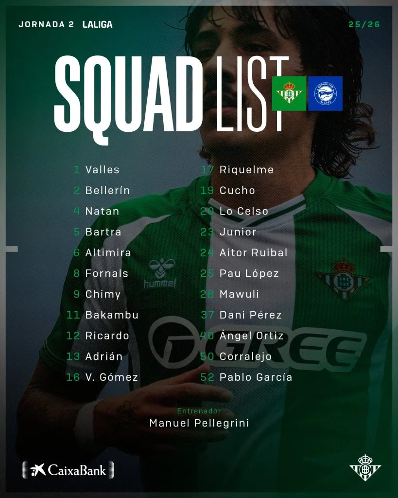 No obstante, por desgracia para los béticos, ni en el debut ni en este segundo encuentro liguero podrán contar con su fichaje más caro: Nelson Deossa. El equipo español le pagó más de 10 millones de euros a Rayados de Monterrey por la ficha del centrocampista colombiano, pero su estreno todavía está lejos, tanto así que ni siquiera fue convocado para el choque con Alavés.