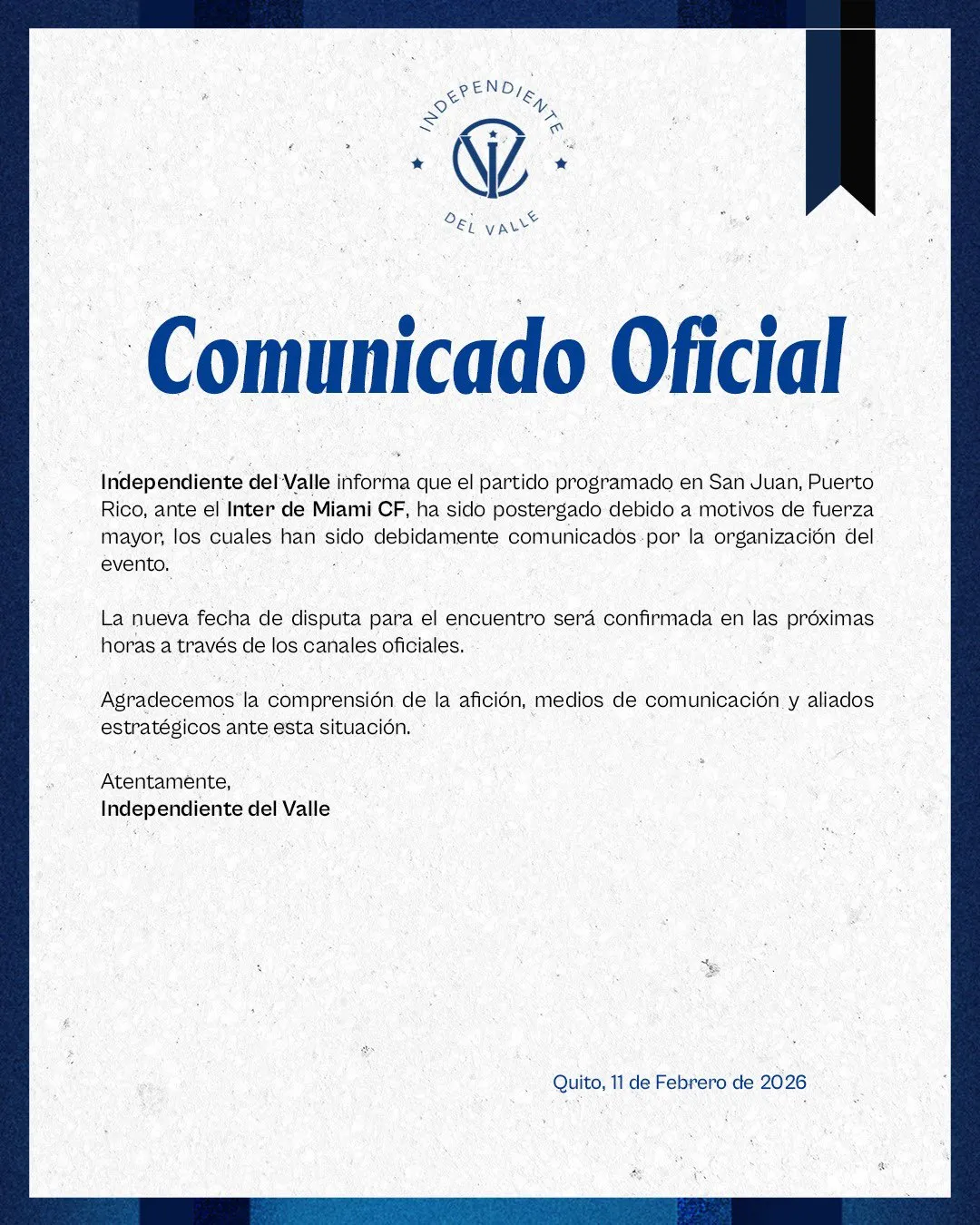 El club ecuatoriano publicó un comunicado oficial explicando la situación: “Independiente del Valle informa que el partido programado en San Juan, Puerto Rico, ante el Inter de Miami CF, ha sido postergado debido a motivos de fuerza mayor, los cuales han sido debidamente comunicados por la organización del evento. La nueva fecha de disputa para el encuentro será confirmada en las próximas horas a través de los canales oficiales. Agradecemos la comprensión de la afición, medios de comunicación y aliados estratégicos ante esta situación”.