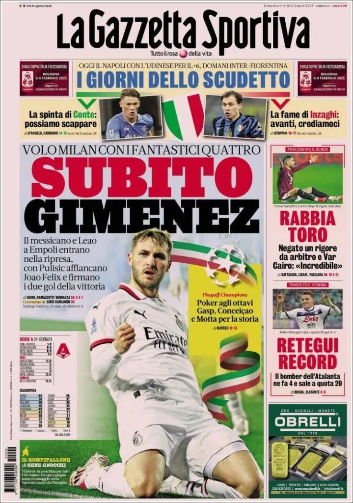 Tras el gran rendimiento de Santi Giménez y el equipo en general, la prensa italiana se rindió a los pies del mexicano y de tres de sus compañeros. En La Gazzetta Sportiva así lo describieron: “Son los cuatro fantásticos”, haciendo referencia a Santiago Giménez, Joao Félix, Christian Pulisic y Rafael Leão, quienes están marcando la diferencia en el ataque rossonero.