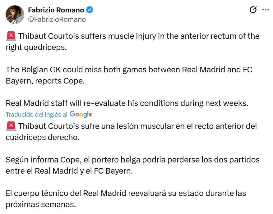 Luego de los estudios médicos correspondientes, el club confirmó el diagnóstico a través de un comunicado oficial: “Tras las pruebas realizadas hoy a nuestro jugador Thibaut Courtois por los Servicios Médicos del Real Madrid se le ha diagnosticado una lesión muscular en el recto anterior del cuádriceps derecho. Pendiente de evolución”.