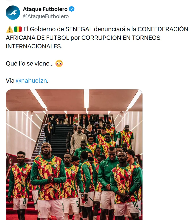 Según informó el periodista Nahuel Lanzón, el Gobierno de Senegal no se quedará de brazos cruzados y ya prepara una denuncia formal contra la Confederación Africana de Fútbol. La acusación apunta a presuntos actos de corrupción en torneos internacionales, lo que eleva aún más la gravedad del conflicto.