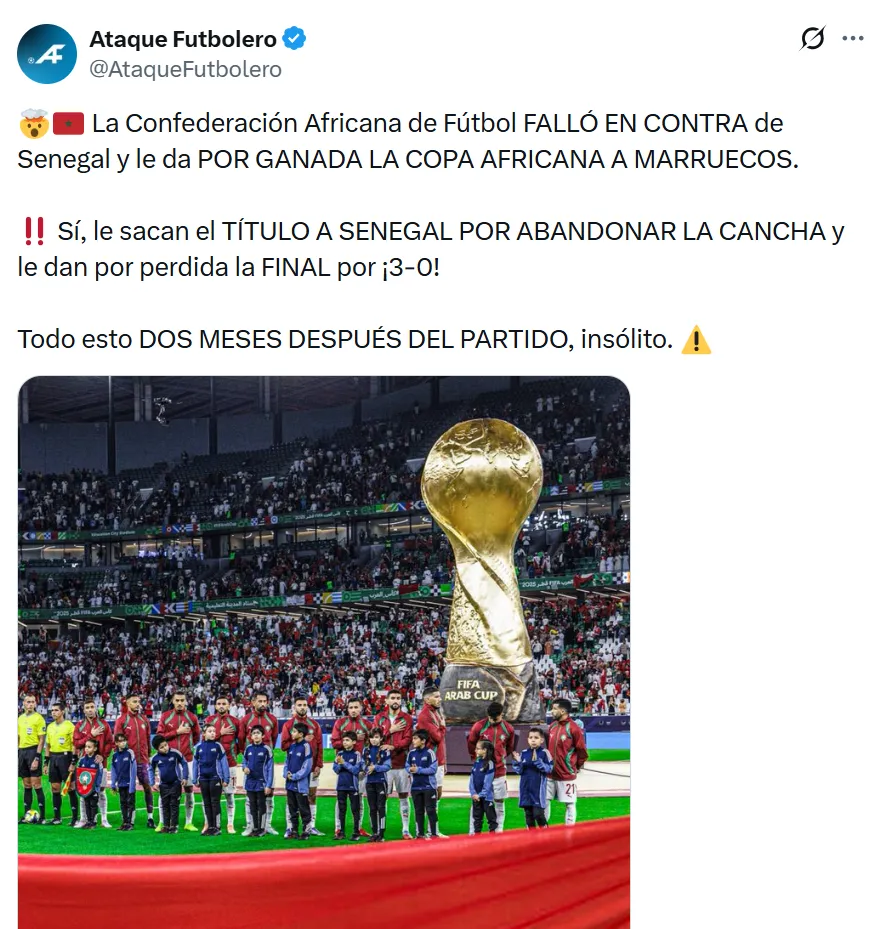 La decisión no tardó en generar repercusiones. Mientras en Senegal crece la indignación, en Marruecos la noticia fue recibida con euforia: miles de aficionados marroquíes salieron a las calles a festejar la obtención del título tras el fallo oficial.