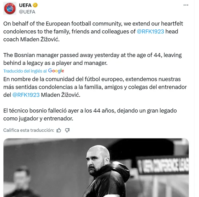 “En nombre de la comunidad del fútbol europeo, extendemos nuestras más sentidas condolencias a la familia, amigos y colegas del entrenador Mladen Žižović. El técnico bosnio falleció ayer a los 44 años, dejando un gran legado como jugador y entrenador”, escribieron en sus redes sociales.
