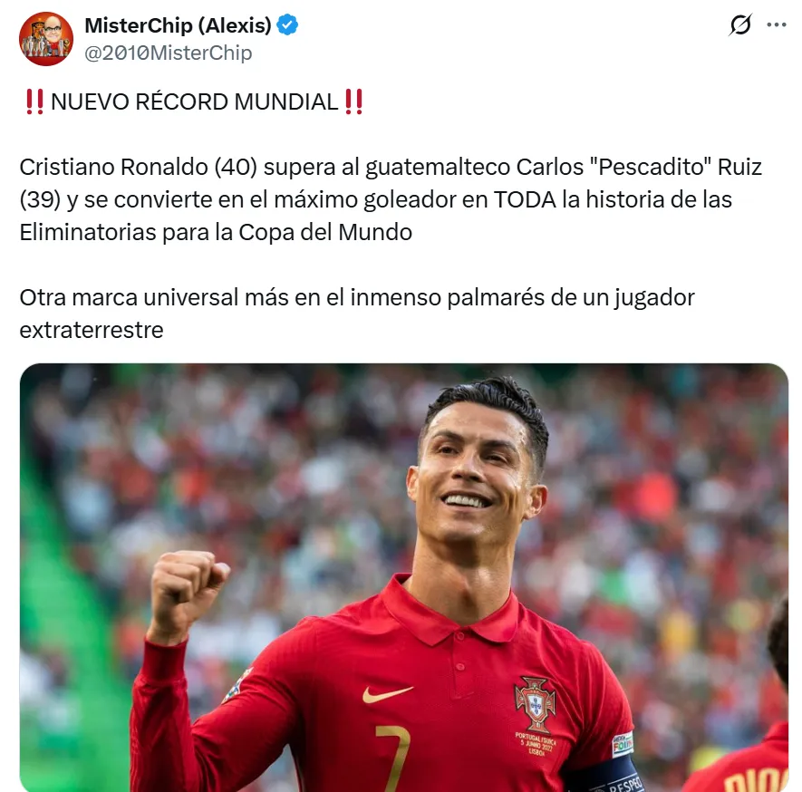 Con este doblete, Cristiano Ronaldo alcanzó los 41 goles en Eliminatorias con Portugal, superando al guatemalteco Carlos “Pescadito” Ruiz (39) y convirtiéndose en el máximo goleador de la historia a nivel eliminatorias rumbo al Mundial.