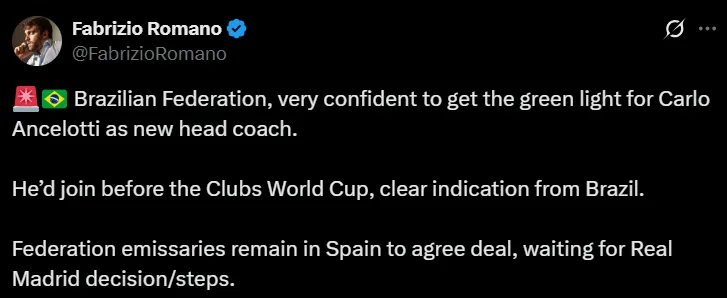 “La Confederación Brasileña está muy confiada en recibir luz verde de Carlo Ancelotti para ser su nuevo entrenador”, manifestó el comunicador, quien incluso dio cuenta que el estratega de 65 años se uniría al conjunto brasileño antes del comienzo del Mundial de Clubes 2025, cuya fecha de inicio está estipulada para el 14 de junio. Además, agregó que emisarios brasileños se encuentran en España para terminar de acordar el contrato, a la espera de la decisión de la entidad merengue.