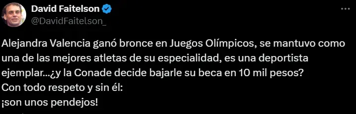 “Alejandra Valencia ganó el bronce en los Juegos Olímpicos, se mantuvo como una de las mejores atletas de su especialidad, es una deportista ejemplar… ¿y la CONADE decide bajarle su beca en 10 mil pesos? Con todo respeto y sin él: ¡son unos pendejos!”, escribió Faitelson.