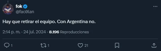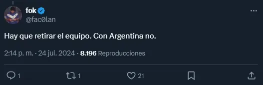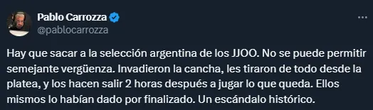 De hecho, el periodista Pablo Carrozza fue uno de los primeros que manifestó el deseo de que la Albiceleste no siga participando. Y a continuación, cientos y miles de aficionados se adhirieron al pedido, como así también criticaron al arbitraje y la organización.