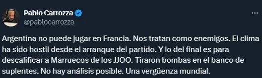 Los Juegos Olímpicos 2024 comenzaron con un hecho tanto inesperado como polémico. Como es sabido, el juego de futbol entre Argentina y Marruecos dio mucho de qué hablar por el final que tuvo. Y por supuesto, los fanáticos argentinos no reaccionaron de buena forma a lo sucedido, y así lo manifestaron en las redes.