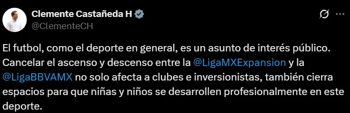 “Es una verguenza que se esté obstaculizando la posibilidad de que quienes ganan la Liga de Expansión puedan subir a la Primera División. Vamos a poner ese tema sobre la mesa porque el futbol es un asunto de interés público, no puede ser un negocio en manos de los privados (…) le están cancelando la posibilidad a hombres y mujeres, que se quieren dedicar al futbol, de tener alternativas de desarrollo deportivo”, manifestó en diálogo con distintos medios de comunicación. Asimismo, realizó una publicación en su cuenta personal de X (ex Twitter) que se encontraba en la misma sintonía.