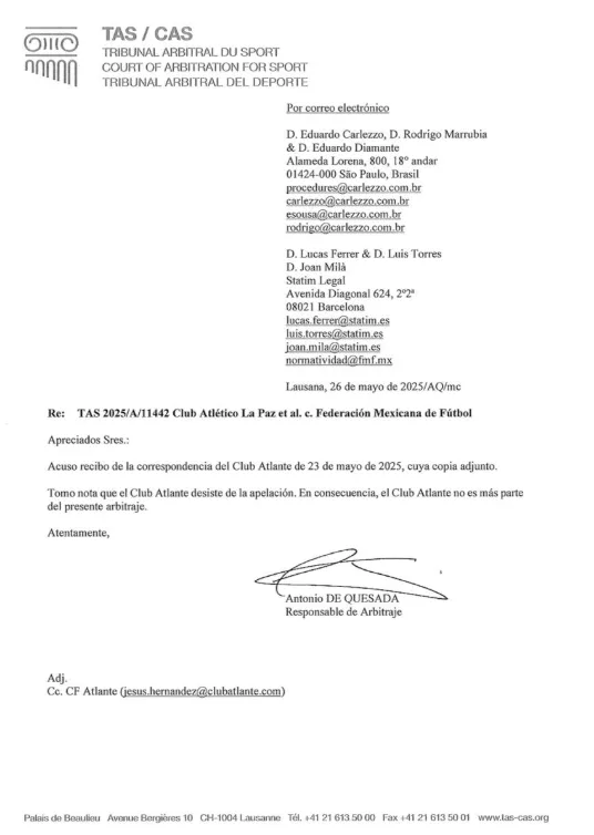 Se trata nada menos que del histórico Atlante, tal como informó el mencionado organismo con sede en Lausana, Suiza, en las últimas horas. “Toma nota que Club Atlante desiste de la apelación. En consecuencia, el Club Atlante no es más parte del presente arbitraje”, se consignó.