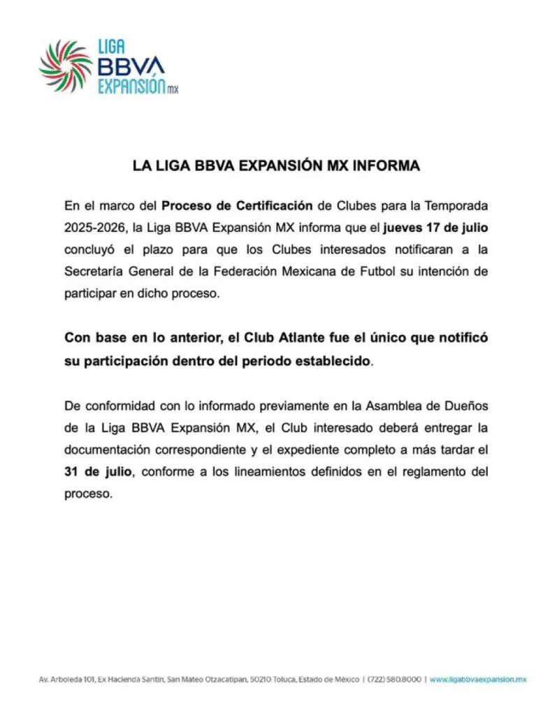 Se trata de Atlante, el único de los 15 equipos de la segunda categoría que realizará el proceso para regresar a la Liga MX por el camino administrativo, tal como informó la Liga de Expansión en un comunicado oficial. En ese sentido, el organismo recordó que el plazo para la inscripción se venció el jueves 17, por lo que ya no habrá posibilidades de que otro equipo se una a las aspiraciones de los Potros de Hierro.