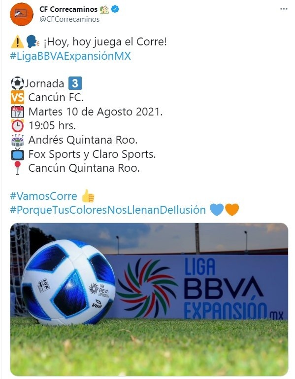 Se puso en marcha el desarrollo del fútbol de la segunda división mexicana. En este caso dentro dela jornada 3de la Liga BBVA Expansión MX, precisamente delTorneo Grita México Apertura 2021,lo cierto es que Cancún FCchocará ante Correcaminos UAT. Este partido va a tener lugar en elEstadio OlímpicoAndrés Quintana RooHOY,martes 10 de agosto, el cual contará con la transmisión EN VIVO y EN DIRECTOde FOX Sports 2,Marca Claro,Claro SportsyFanatizdesde las 19:05 horas CDMX.
