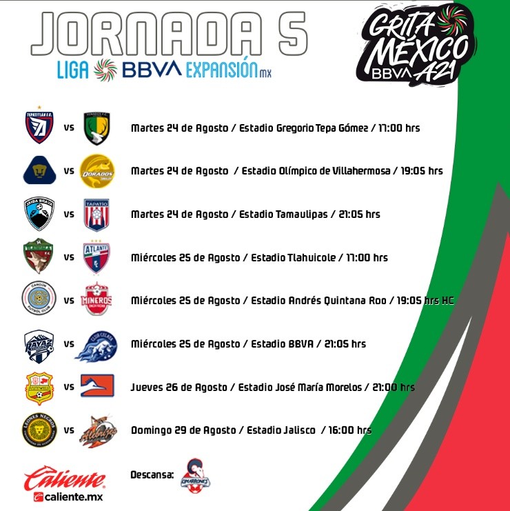 La quinta jornada del Torneo Apertura 2021 de la Liga BBVA Expansión MXcomenzará HOY,martes 24 de agosto, con lo que será el duelo entreTepatitlán y Venados de Yucatán, el cual se efectuará desde las17:00 horas CDMX.