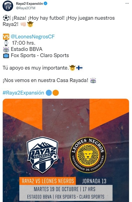 El partido de Raya2 Expansión vs. Leones Negros UAT será HOY, martes 19 de octubre, en el Estadio BBVA desde las 17:00 horas CDMX.