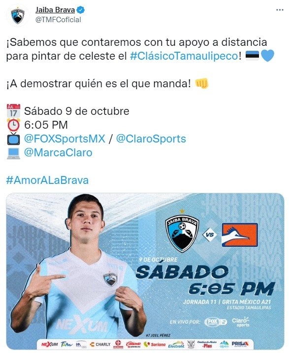 Se viene un gran duelo porque se trata ni más ni menos que del Clásico Tamaulipeco. Dentro de lo que va a ser la continuidad de la novena jornada por laLiga BBVA Expansión MX, en este casoTorneo Grita México Apertura 2021, lo cierto es queTampicoMadero se medirá contraCorrecaminos UAT. Este partido va a tener lugar en elEstadio TamaulipasHOY,sábado 9 de octubre, el cual contará con la transmisión EN VIVO y EN DIRECTO de FOX Sports 2,Marca Claro,Claro SportsyFanatizdesde las 18:05 horas CDMX.
