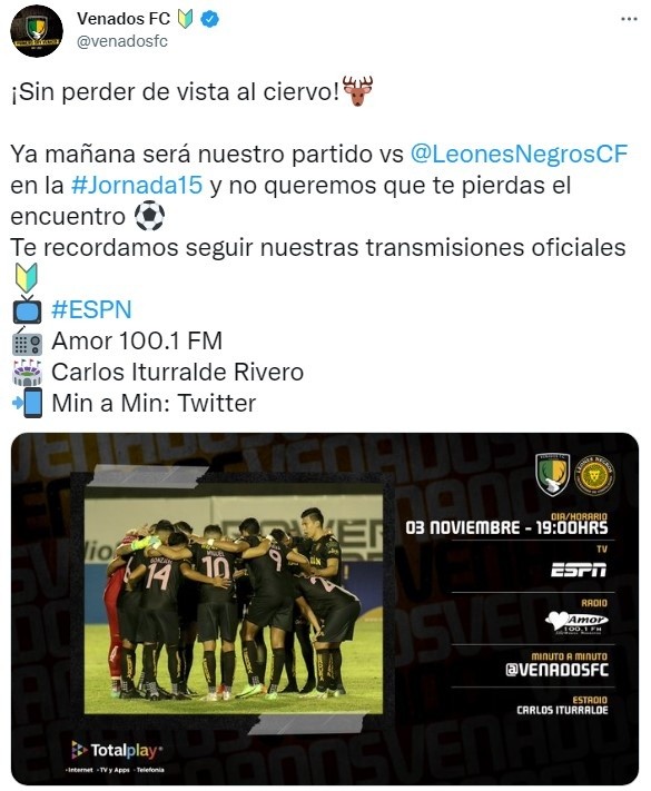 Dentro de lo que será la jornada 15 de la Liga BBVA Expansión MX, en este casoTorneo Grita México Apertura 2021,lo cierto es queVenados de Yucatánchocará frente a Leones Negros.Este partido va a tener lugar en elEstadio Carlos Iturralde RiveroHOY,miércoles 3 de noviembre, el cual contará con la transmisión EN VIVO y EN DIRECTOde ESPN 2y Star+desde las 19:05 horas CDMX.
