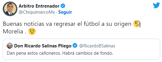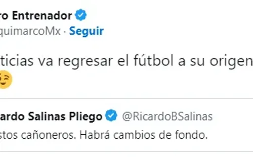 “Dan pena estos cañoneros. Habrá cambios de fondo”, publicó Salinas Pliego después de que Mauro Lainez anotara el tercer gol de Bravos. Este post fue tomado por Marco Antonio Rodríguez, quien provocó al magnate insinuando el regreso de Monarcas al futbol mexicano.