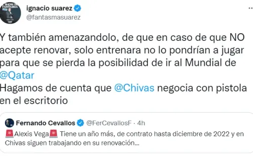 “En Chivas siguen trabajando en su renovación. Y también amenazandolo, de que en caso de que NO acepte renovar, solo entrenara no lo pondrían a jugar para que se pierda la posibilidad de ir al Mundial de@Qatar. Hagamos de cuenta que@Chivas negocia con pistola en el escritorio“, sentenció el ‘Fantasma’.