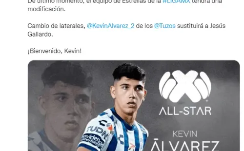 Según publicó la organización a través de su Twitter oficial, el defensa de Rayados de Monterrey, Jesús Gallardo, causará baja en el All-Star Game. En su lugar por el lateral estará el elemento de los Tuzos del Pachuca, Kevin Álvarez, siendo este el séptimo cambio en el equipo que representará a México.