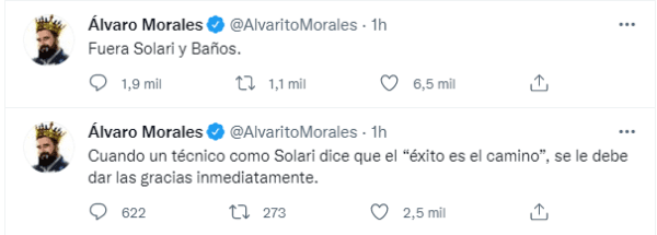 Por su parte, Álvaro Morales fue picante como nunca ante y pidió que rueden las cabezas del cuerpo técnico y del director deportivo. “Cuando un técnico como Solari dice que el ‘éxito es el camino’, se le debe dar las gracias inmediatamente. Fuera Solari y Baños”, comenzó el polémico conductor. Y agregó: “Solari debe presentar su renuncia inmediatamente”.