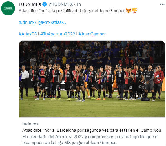 El Trofeo Joan Gamper está programado para el próximo 6 de agosto. Dos días antes (el 4/7), el Atlas debe disputar la Jornada 7 del Torneo Apertura 2022 ante Querétaro, mientras que el lunes 8 del mismo mes, seis jugadores titulares y el entrenador deberán reportar en Minnesota para el Juego de las Estrellas de la Liga MX vs. MLS.