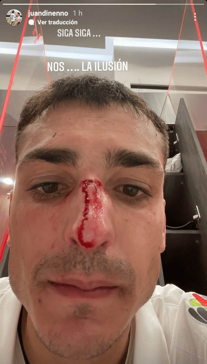 Consumada la clasificación de los Zorros, Juan Dinenno no dejó pasar su coraje y desde los vestidores cargó contra el arbitraje a través de su cuenta de Instagram.“Siga Siga. Nos… la ilusión”, fue la frase que el goleador eligió para acompañar su foto de primer plano con su cara completamente afectada por el golpe.