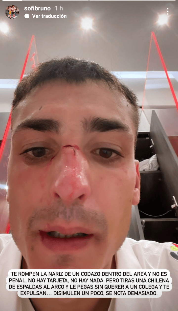 Por si fuera poco, la cosa siguió en las redes sociales de la esposa del futbolista, Sofía Bruno, quien le dedicó dos Stories al silbante.“Te rompen la nariz de un codazo dentro del área y no es penal, no hay tarjeta, no hay nada, pero tiras una chilena de espaldas al arco, le pegas sin querer a un colega y te expulsan… disimulen un poco, se nota demasiado”, escribió en uno de ellos. Y remató con: “Siga siga”.