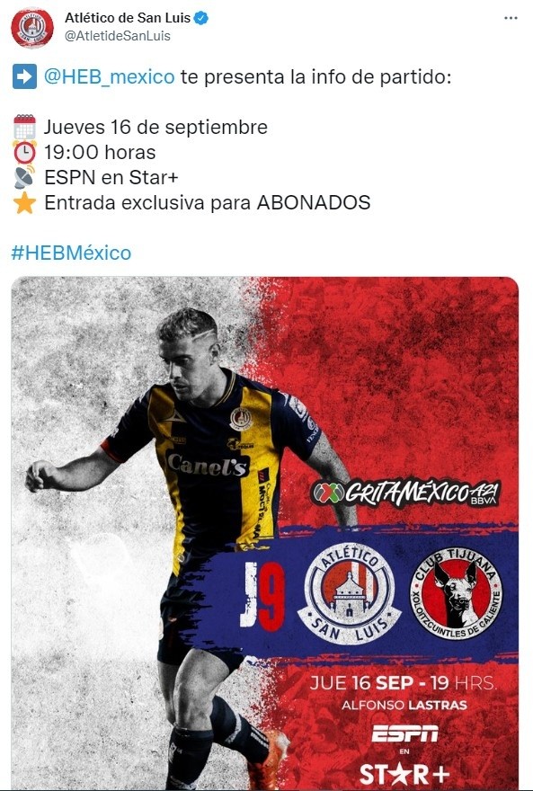 Atlético San Luis jugará contra Xolos de Tijuana HOY, jueves 16 de septiembre, desdeel Estadio Alfonso Lastras por la jornada 9de la Liga MX , con horario estipulado para las 19:00 CDMX.